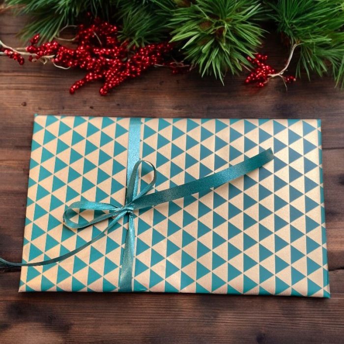 Jólagjafapappír í gylltum lit með grænu þríhyrningamynstri. Nýtískulegur en heldur jafnframt í hefðir. Grænu þrihyrningarnir vísa til jólatrjáa, sem býr til notalegt og hlýtt andrúmsloft umhverfis gjafirnar.