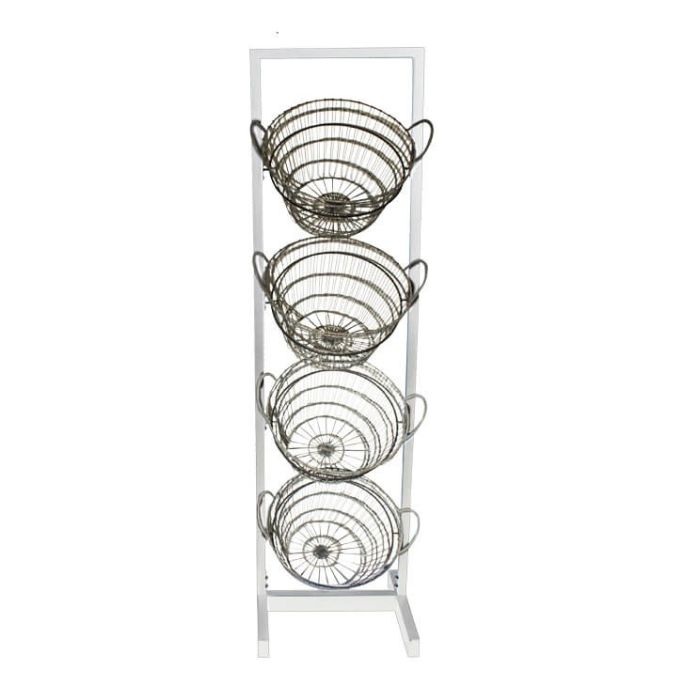 Körfustandur með 4 málmkörfum fyrir vöruútstillingar.