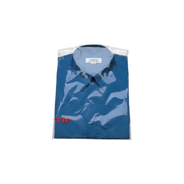 Plastpokar án handfanga, tilvaldir til að vernda skyrtur, föt eða svipaða hluti, með límbandslokun.
