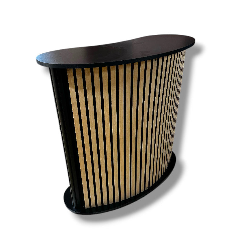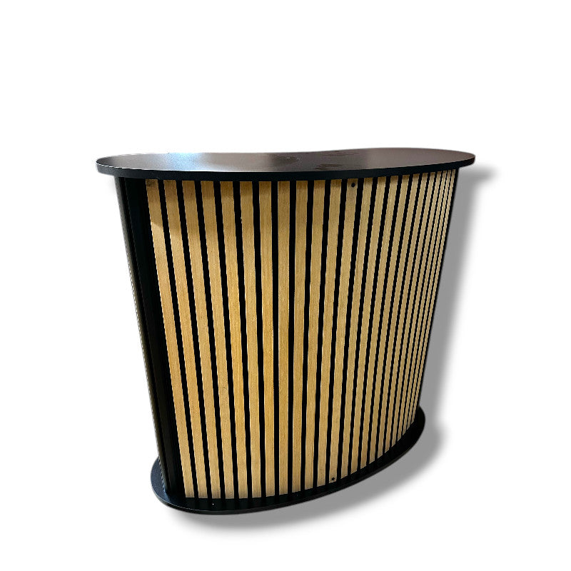 Beygður diskur með hillu. Framhlið með hljóðdeyfir / viðarlamellum. B104 x D43 x H105 cm.