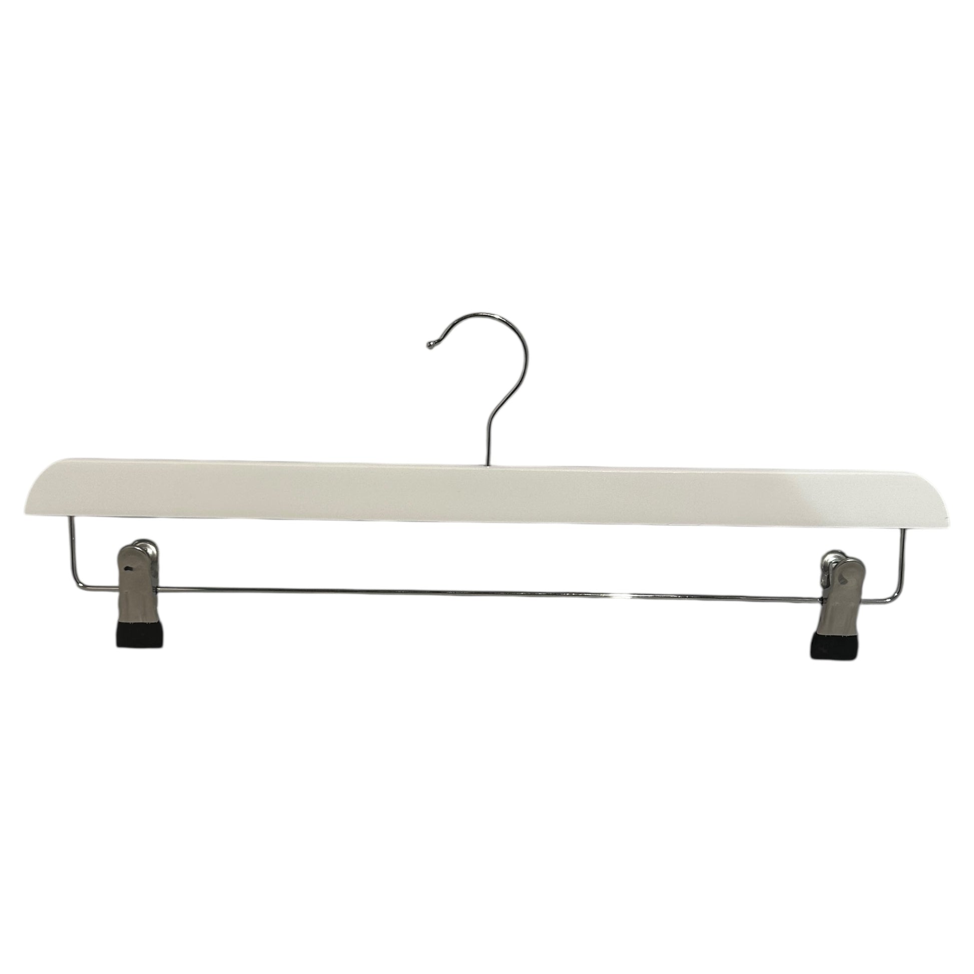 Herðabogar til buxna með klömpum úr tré. Hentar vel til sýningar bæði buxna og pils. Tveir klömpar á herðaboganum eru með gúmmíhúðun sem verndar fötin. Klömpurnar er hægt að færa til, svo herðabogarnir geta haldið buxum og pilsum í mismunandi stærðum. Herðaboginn kemur með venjulegum 3 mm krók sem passar við stærðarmerkingar okkar fyrir herðaboga (varenr.: 4045). Hægt er að fá buxnaherðabogann í minni stærð. Mál herðaboga: B 45 cm. Litir herðaboga: Hvítur (4021-01) Natur (4021-59) Svartur (4021-04). Pakkning: 50 stk. Verð sýnt á stk.