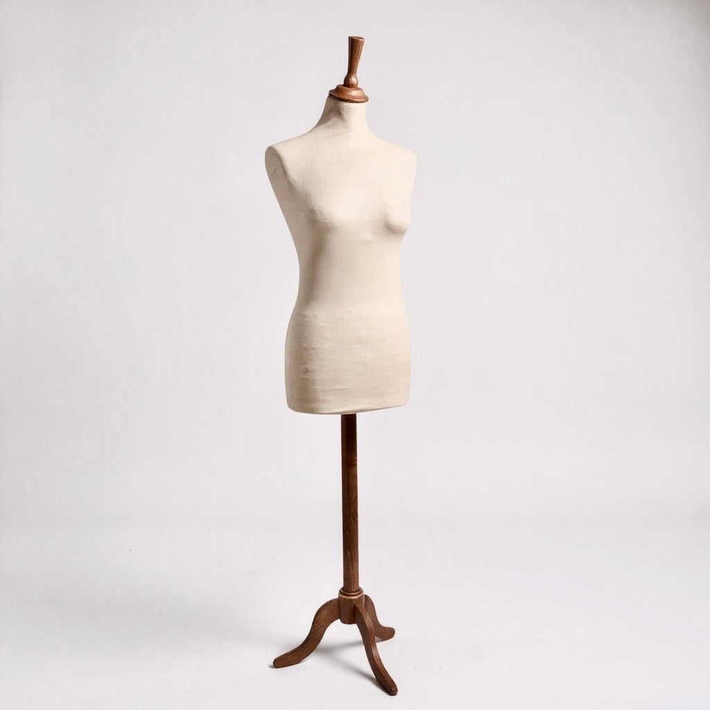 Damakropp með línlitaðri nylon vef á bol. Þessi gína er með 3-fótabotni/viðarfóti og háum „Shaker“ toppi í valhnetu. Bolurinn á þessari gínu er langur líkami.