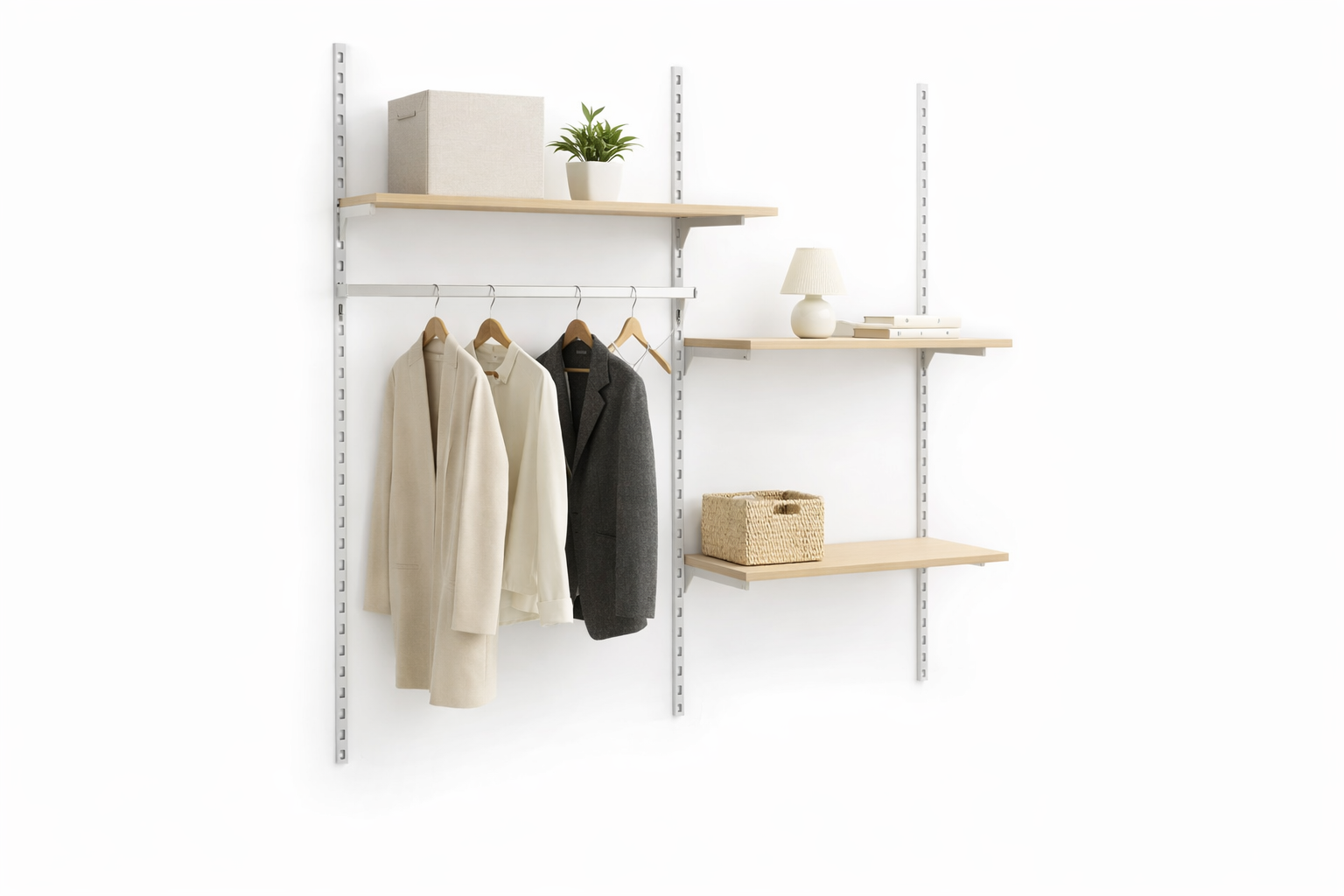 Løsningen består af hvide vægskinner, hyldeknægte, dekostang og melaminhylder i bøg, som tilsammen giver en praktisk opbevaringsplads til hverdagens ting. | Venjulegt verð
