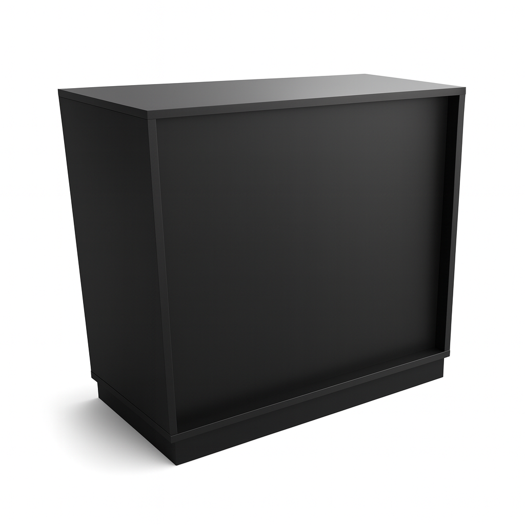 Frame-disk – breitt módel, svartur. Stöðugur og fallegur búðarborði í svörtu melamíni. Skiptingar og hilla halda tökunum í lagi, á meðan hjólið gerir hann auðvelt að færa. Hentar bæði einn og sem módel í stærri borðuppsetningum. Framhliðina er auðvelt að hanna eftir búðinni. Það er gat í hillunni fyrir snúruleiðslu, svo kassavél, ljós, tölva eða hleðslutæki má tengja án tilvistar. B110 x D55 x H91 cm (með hjólum H93 cm)