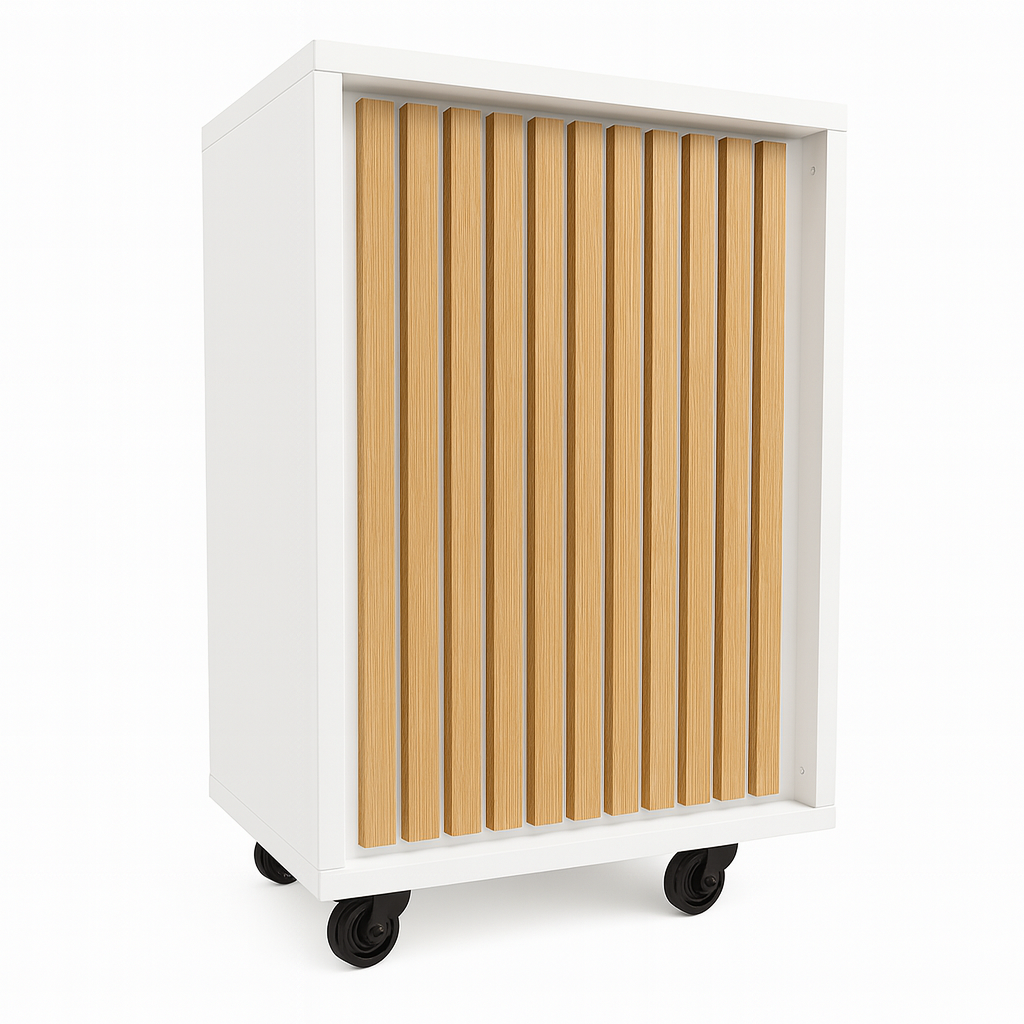Frame-disk – smalt modul, hvid. En praktisk og lys disk. Disken er lavet i melamin med struktur. Fronten er tilbagetrukket, så den kan styles med logo, træfront eller bruges, som den er. Disken har en indvendig hylde, der har plads til eventuelle kabler. Hjul medfølger. Disken kan stå alene eller bygges i vinkel/U-form. B55 x D55 x H91 cm (med hjul H93 cm)