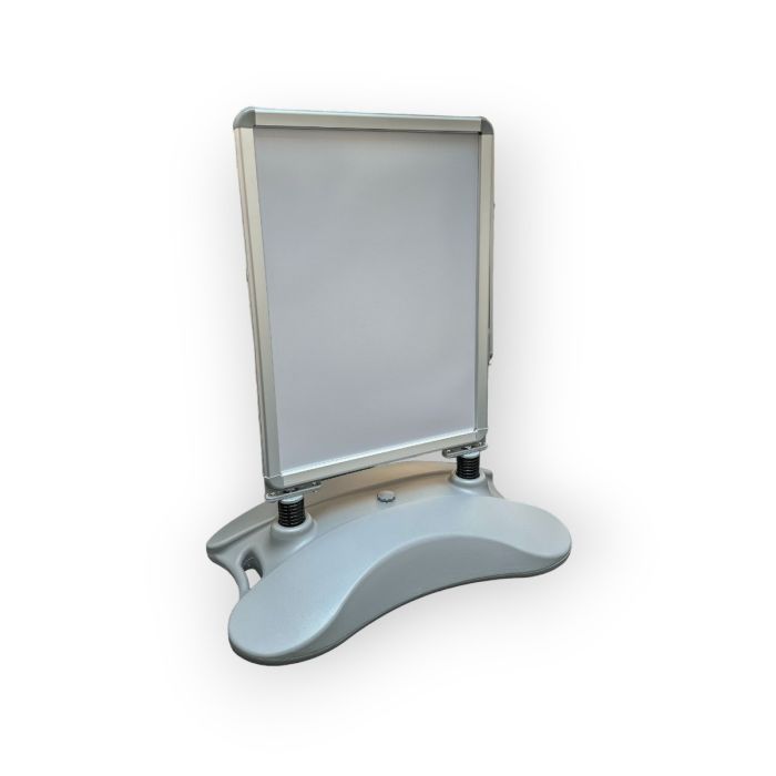 Stormmaster götuskilti fyrir plakat í stærðinni 50 x 70 cm. Sérstakt við þetta götuskilti er að það er monterað á fjöðrum. Þessar fjöður veita skiltinu nauðsynlega sveigjanleika, sérstaklega þegar blæs, og fóturinn er gerður úr höggþolnu plasti sem má fylla annað hvort með vatni eða sandi. Til að koma í veg fyrir frostskemmdir er hægt að fylla það með frostvökva sem kemur í veg fyrir að vatnið frjósi. Þar að auki eru tvær hjól settar á skiltið og með handfanginu er hægt að hnika því upp og auðveldlega flytja það eftir þörfum. Tveir reflex-frírir PET-plötur fylgja með. Skiltið kemur með snap-ramma sem gerir það fljótt og auðvelt að skipta um plakat eftir þörfum. Hornin eru varin með sterkum plastkornum sem einnig gefa fallega frágang á rammann. Mál: H 98 x 81 x 51 cm, inkl. handfang. Plakatmál 50 x 70 cm. Ál-lituð / grá. Nýjar PET-plötur er hægt að kaupa undir varanr.: 6998-00
