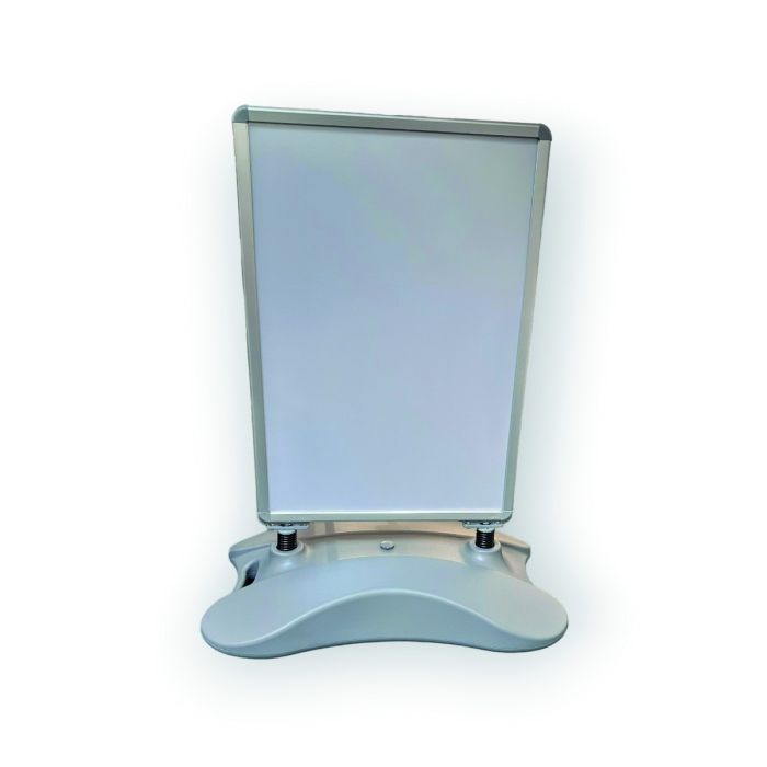 Stormmaster gatuskilt til plakater i størrelsen 70 x 100 cm. Det særlige ved dette gadeskilt er, at skiltet er monteret på fjedre, som giver den nødvendige fleksibilitet, især når det blæser. Foden er fremstillet af slagfast plast og kan fyldes med enten vand eller sand. For at undgå frostskader kan den også fyldes med frostvæske, så vandet ikke fryser. Der er desuden monteret to hjul på skiltet, hvilket gør det muligt at vippe og let flytte det rundt efter behov. Der medfølger to refleksfri PET-plader. Mål: H133 x 98 x 61 cm. Plakatmål: 70 x 100 cm. Alufarvet / grå. Nye PET-plader kan tilkøbes på varenr.: 7028-00