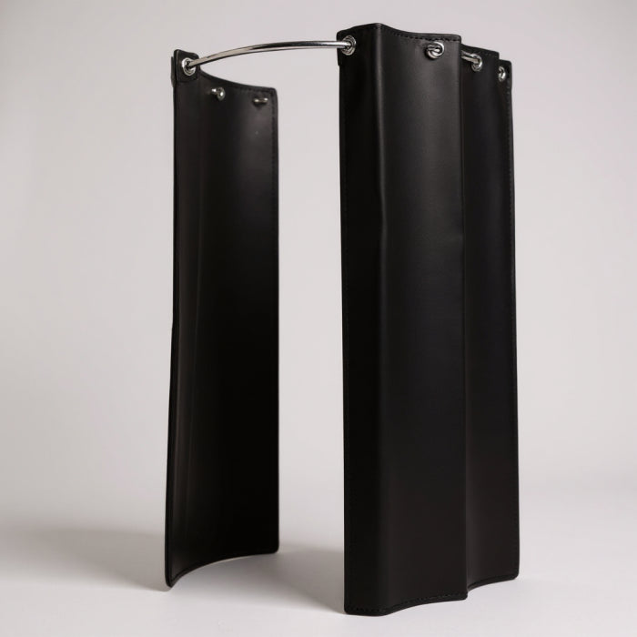 Gardínustöng, hálfhringur. Þessi gardínustöng hefur þvermál 25 mm, sem gerir kleift að nota mismunandi gerðir af gluggatjöldum. Hægt er að nota hana með hefðbundnu gluggatjaldi og gardínuhringum, tjaldi með böndum eða kófsum (járnhringir stærri en 25 mm). Stöngin má nota til að búa til U-laga eða hálfhringlaga gómsdyr eða reynsluaðstöðu sem auðvelt er að festa á vegg. Gluggatjöldin er hægt að ýta til hliðar svo þau taki ekki pláss þegar reynsluaðstaðan er ekki notuð. Þetta veitir létta og loftkennt lausn fyrir reynsluaðstöðu, frábær fyrir verslanir með takmarkað rými. Mál: 98 x B103 cm. Stöng Ø25 mm. Króm. Innifalin veggfesta og vírsuspension.