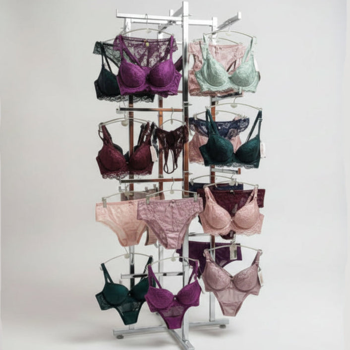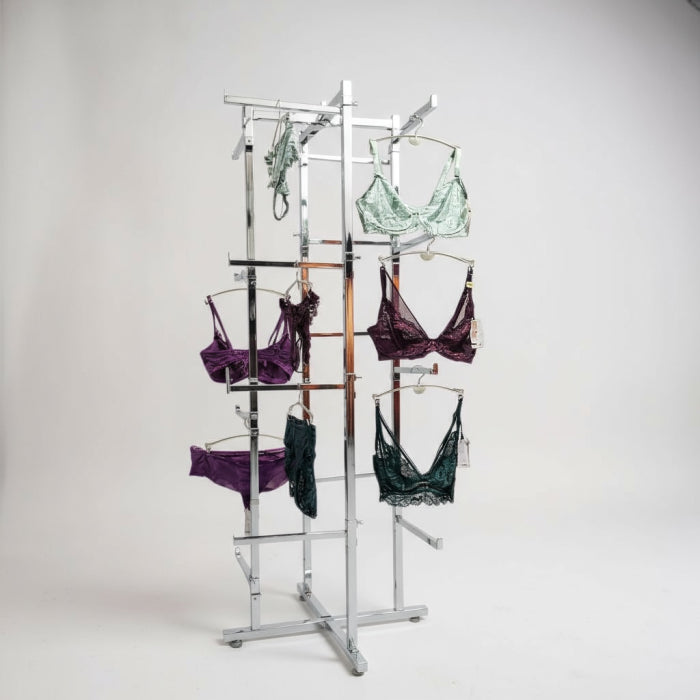 Kompakt sýningastand með 16 arma með krómf finish til að hámarka nýtingu gólfpláss. Hentar meðal annars fyrir ungbarnaföt, undirföt, taskur og svipað. Arminir 16 eru færanlegir upp, niður eða hægt að fjarlægja þá alveg eftir því hvað þarf að sýna. Mögulegt er að kaupa auka arma. Gólfstöngin kemur með stilliskónum svo hún standi í láréttu jafnvel þó gólfið sé ójafnt. Hægt er að festa skiltahaldara efst á stangann. Stangastandurinn er auðvelt að brjóta saman til dæmis fyrir sýningar. Mál: 70 x 70 x H 150 cm. Armar: L 30,5 cm.