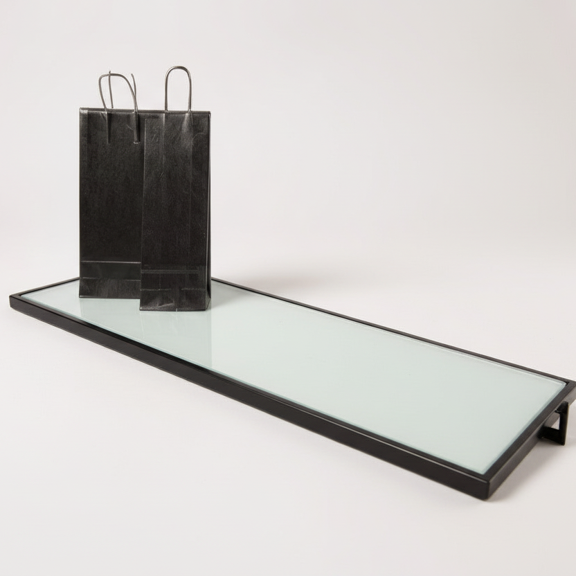 Fullt hyllesett med en frostet glasshylle og hylleramme/stativ i svart. Hyllestativet er enkelt å montere direkte på veggen. Vennligst merk at skruer og rawlplugs ikke er inkludert, da valget av disse avhenger av veggens materiale og struktur der hyllen skal monteres. Mål: B 120 x D 37 x H 10 (på festet) cm. Det er mulig å kjøpe et hyllesett i samme serie med en kombinert klesstang og 2 frontoppheng montert. HAPPY!-serien er designet for å passe inn i rene designstiler og for å skape et minimalistisk og vakkert uttrykk i enhver butikk eller bolig. Bruk HAPPY!-serien i hele butikken eller i et dedikert salgsområde.