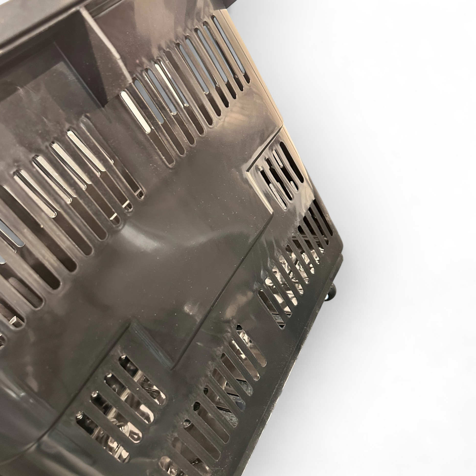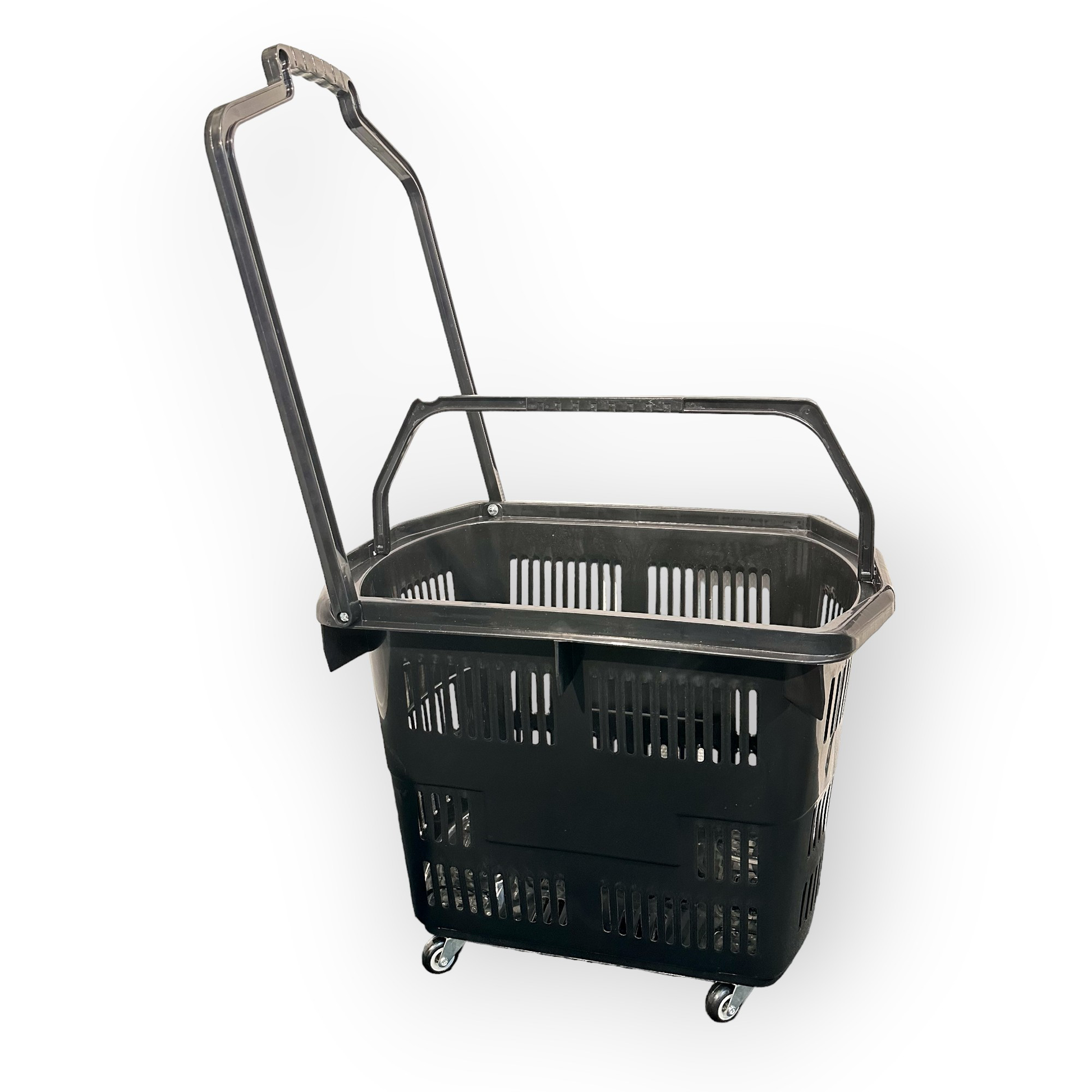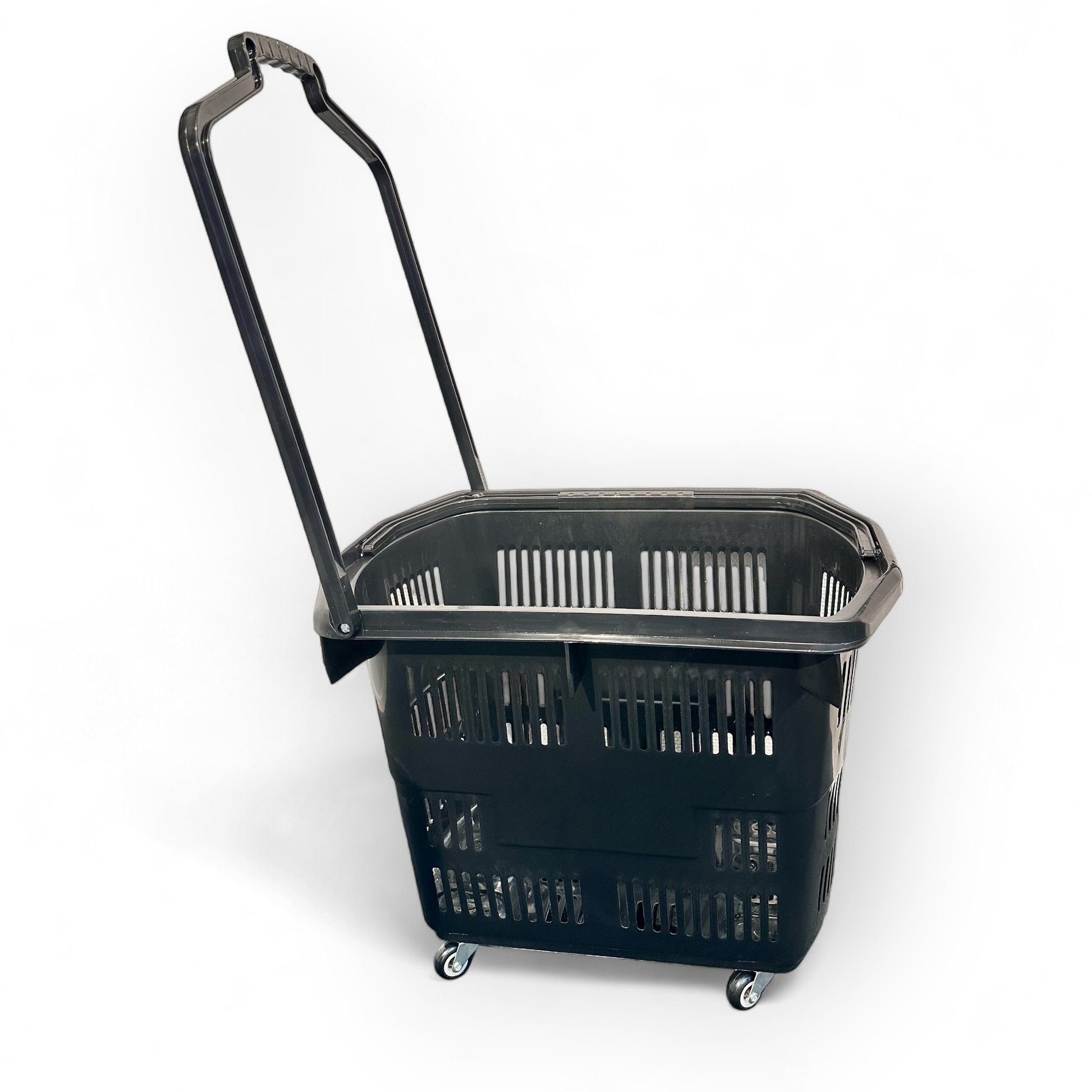 Þessi rúmgóða innkaupakarfa getur rúmað allt að 55 lítra. Körfunni fylgja tvær mismunandi handföng. Hún kemur einnig með 4 litlum gúmmíhjólum (snúningshæf) og draghandfangi, sem gerir auðvelt að stýra henni um verslunina. Mál: B43 x D65 x H46 - Með handfangi H 101 cm. Innanmál: B33 x D52 x H38, 4 hjól. Svartur plast.
