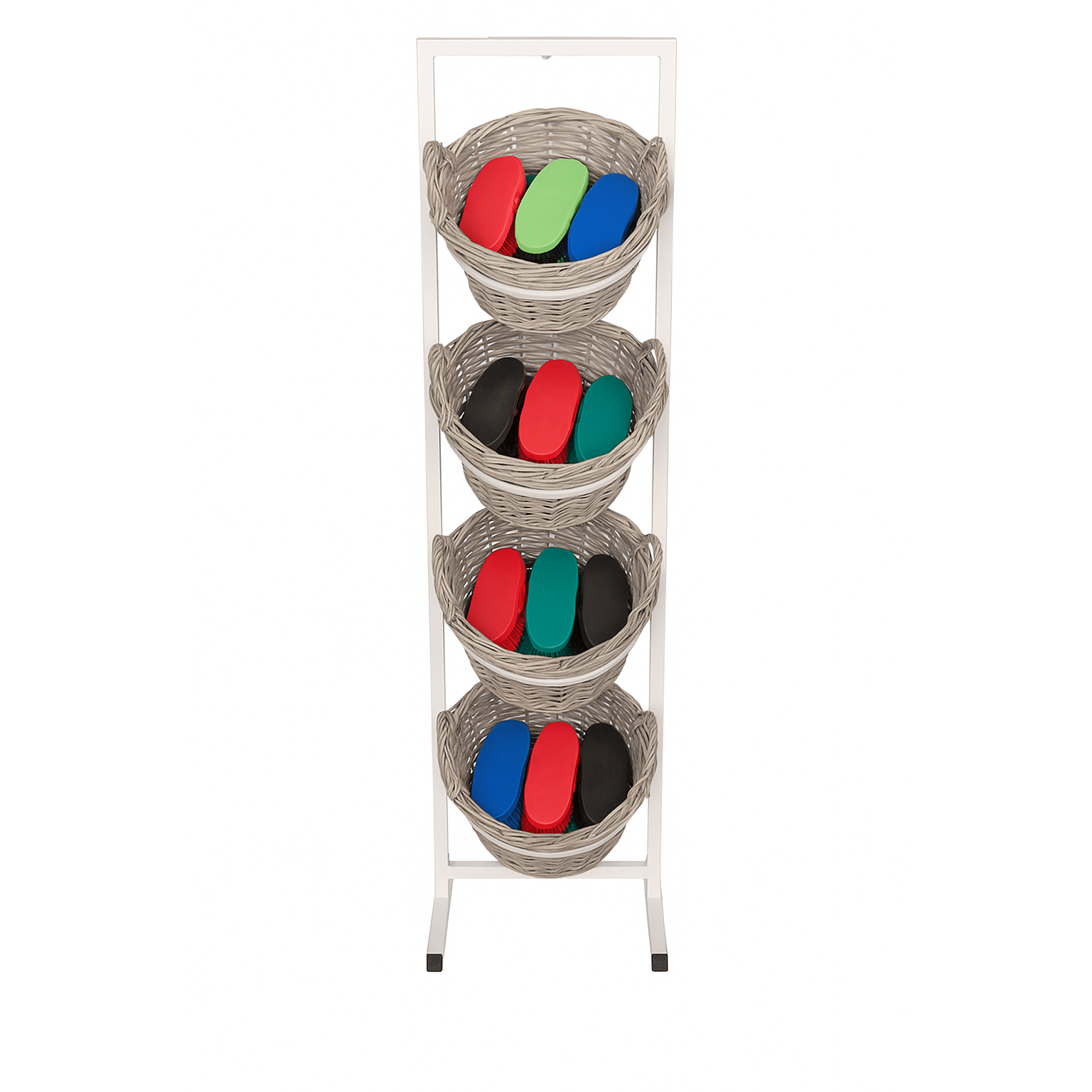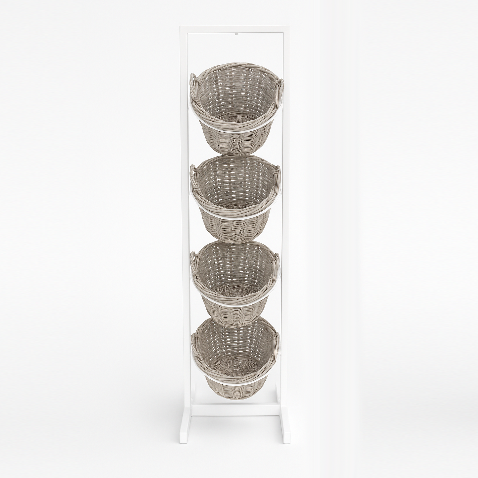 Stelling með 4 körfum fyrir vörurnar þínar. Möguleiki á A4 eða A3 myndarbrjefi af málmi efst. Stellingin er afhent með stillifútum (stillesko). Hjólasett er hægt að kaupa aukalega svo stellingin verði færanleg og auðveldi þrif. Mál: B 45 x H 173 cm. Fótur: B 45 x D 40,5 cm. Körfan hefur slitna áferð í sama stíl og Heritage innréttingarlína okkar. Körfan kemur með plastsáti (plastindlæg). Sátið er fest með litlum vír sem auðvelt er að fjarlægja.