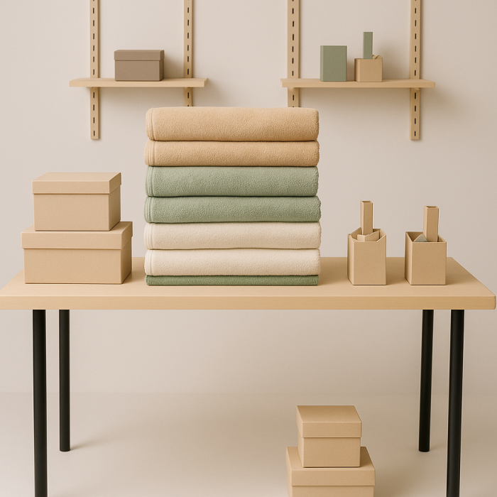 Salgsturn / udstillingsbord. Bordpladerne har en flot struktureret overflade. Vælg type bordben: vinkel i titan (højde H 87,5 cm) eller runde i mat sort (højde 91–94 cm).
