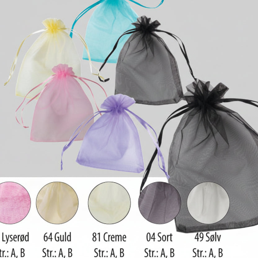 Notaðu litríkar organza-poka til að pakka skartgripum eða smáhlutum inn. Efni-pokarnir koma í miklu úrvali af mismunandi litum og það er hægt að kaupa pokana í tveimur stærðum. Organzapokarnir eru pakkaðir í 25 stk. Mál: B15 x H20 cm.
