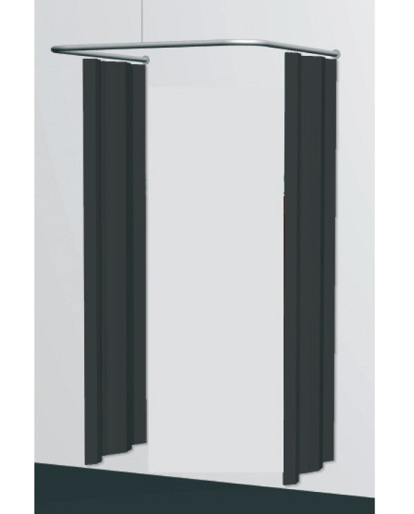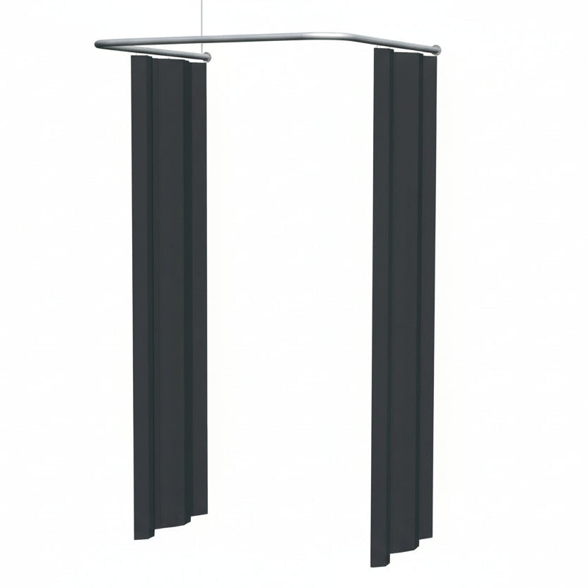 Fittingherbergi til veggoppheng. Dette prøverommet er designet for montering direkte på veggen, noe som gir deg fleksibilitet til å tilpasse høyden etter butikkens behov. Forhenget leveres som standard i en lengde på 190 cm. Gardinstangen monteres på veggen i ønsket høyde, avhengig av hvor mye luft som skal være til gulvet. Det følger også med 4 meter wire, som gjør det mulig å stabilisere gardinstangen midt på med et ekstra takfeste. Når prøverommet ikke er i bruk, kan forhenget enkelt trekkes til siden – det frigjør gulvplass og gir et mer åpent butikkrom.
