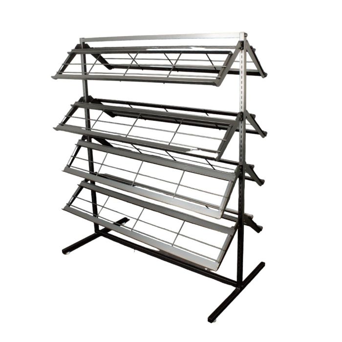 Fallegt og smart skófatan í elegant svörtu. Þetta tvíhliða fataslá hefur alls 8 hillur sem veita nægt pláss til að sýna fjölda skóna eða annarra vörutegunda. Tvíhliða með samtals 8 hillum til að auka sýningarpláss fyrir skó eða aðra varning. Mál: B 125 x D 64 x H 143 cm. Svart fataslá. Fatasláin er einnig fáanleg í króm. Einnig er hægt að kaupa hjól fyrir skófatan til aukinnar hreyfanleika (varenr.: 5009-04)