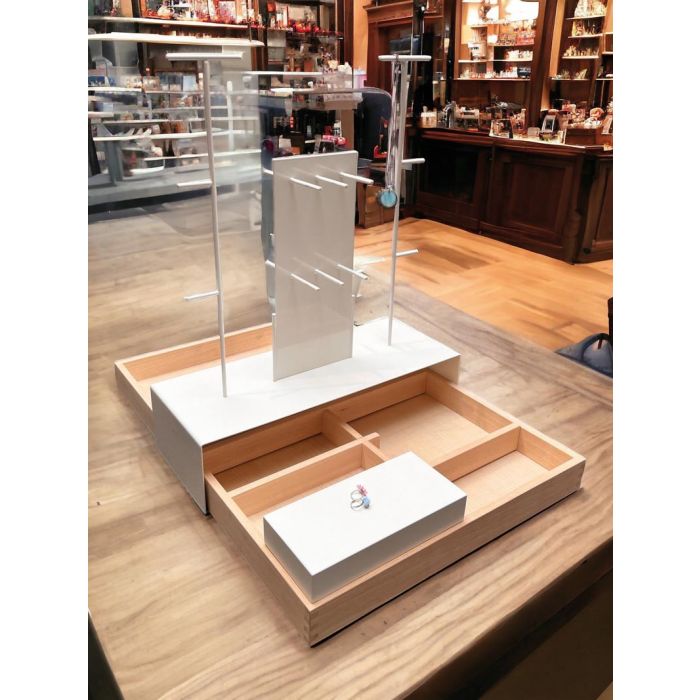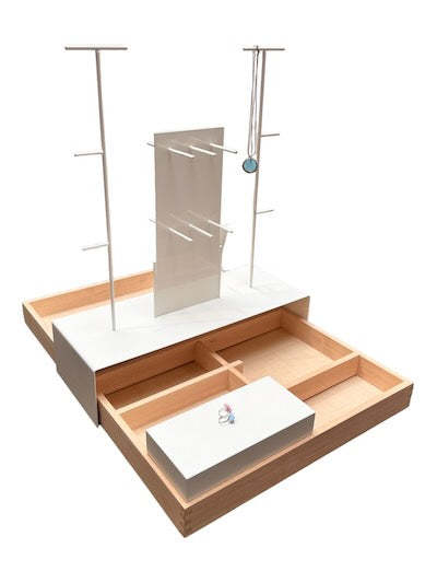 Smykkiskjár úr ljósu viði og hvítur. Viðarbakki með lausum rýmaskiptingum. Málmstöng með hengidiskum í hvítu. Kubbur til sýningar og skiltahaldari í hvítu. Öll hluta eru lausar í sér. Bakkið má nota án aukabúnaðar. Með aukabúnaðinum má innrétta bakka á ótal vegu