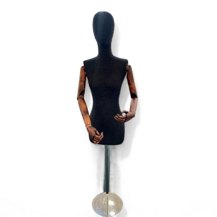 Vintage kvenmynd með bol og höfuð úr svörtu efni. Höfuðið er hægt að snúa og taka af. Myndin hefur dökkbrúnar trénar handleggi. Hringlaga málmfótur í króm