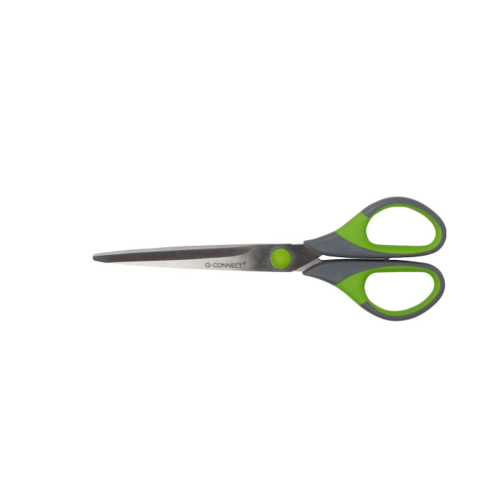 Hagnýt alhliða skæri með grænn/grátt vinnuvistvænt handfang og ryðfrí stálblöð.