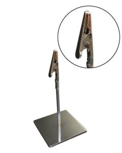 Hvid skilteholder med krokodillenæb. Velegnet til display af mindre salgsinformation på papskilte. H 20 cm.