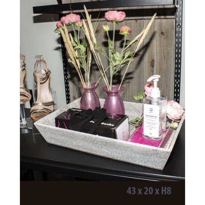 Flottur sölubakki eða sniðug og glæsileg geymslulausn. Þessa fallegu bakka má nota á ótal vegu. Notaðu skapandi leiðir til að gera vinnudaginn léttari. Bakkarnir fást í 2 stærðum. Notað bakkann sem fallega skreytingu á útstillingarborðinu eða uppi í hillu. Bakkinn er gerður úr viði með flekkótt, grábrún yfirborð. Yfirborðið getur verið lítillega breytilegt frá einum bakka til annars og það getur munað fáeinum millimetrum á stærðinni. Stærð: 43 x 30 x H8 sm. Bakkinn er með 2 göt sem má nota sem handfang.