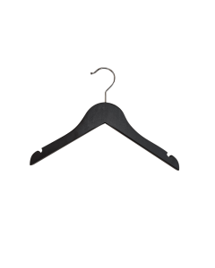 Flatt viðarherðatré með gúmmíklæðningu við öxlina. Í möttum svörtum lit með krómhúðaðan krók.